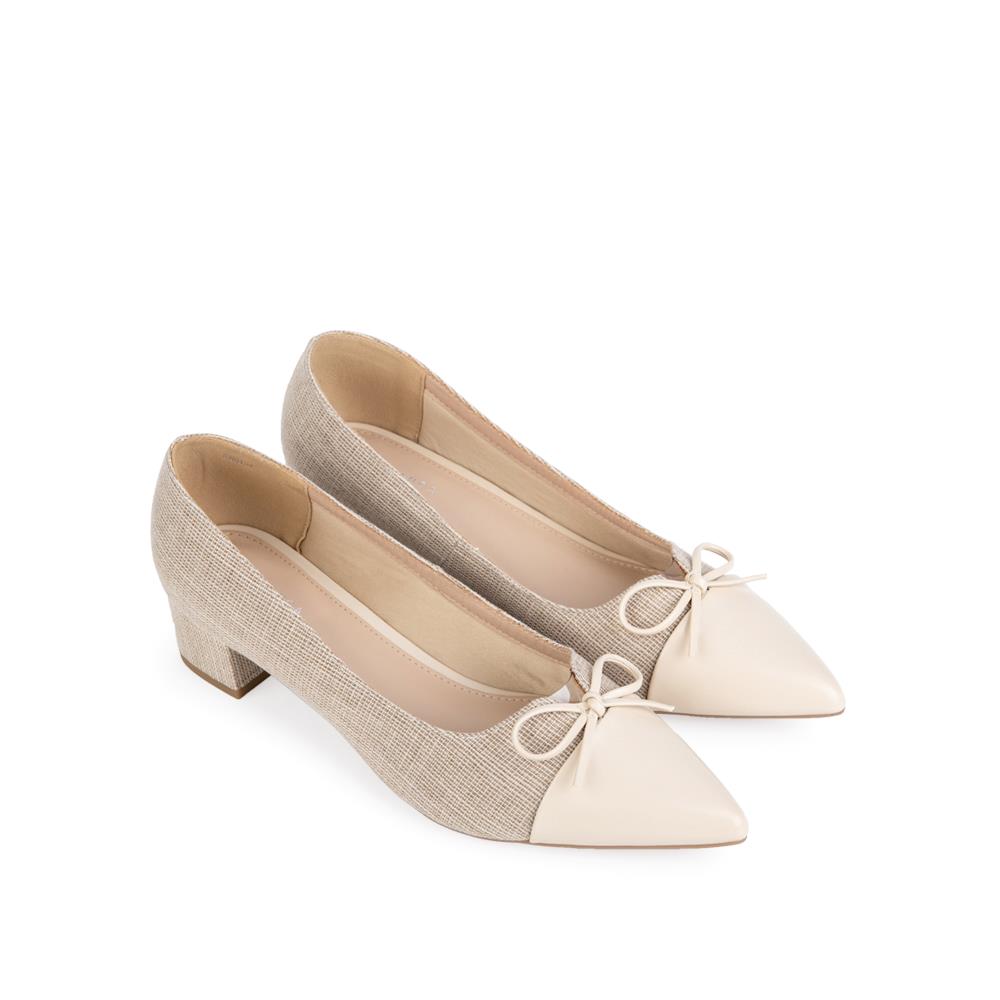 Liệu da tổng hợp kết hợp vải tweed tinh tế, đẹp mắt. Mũi nhọn đính nơ mảnh trang trí vô cùng nữ tính.