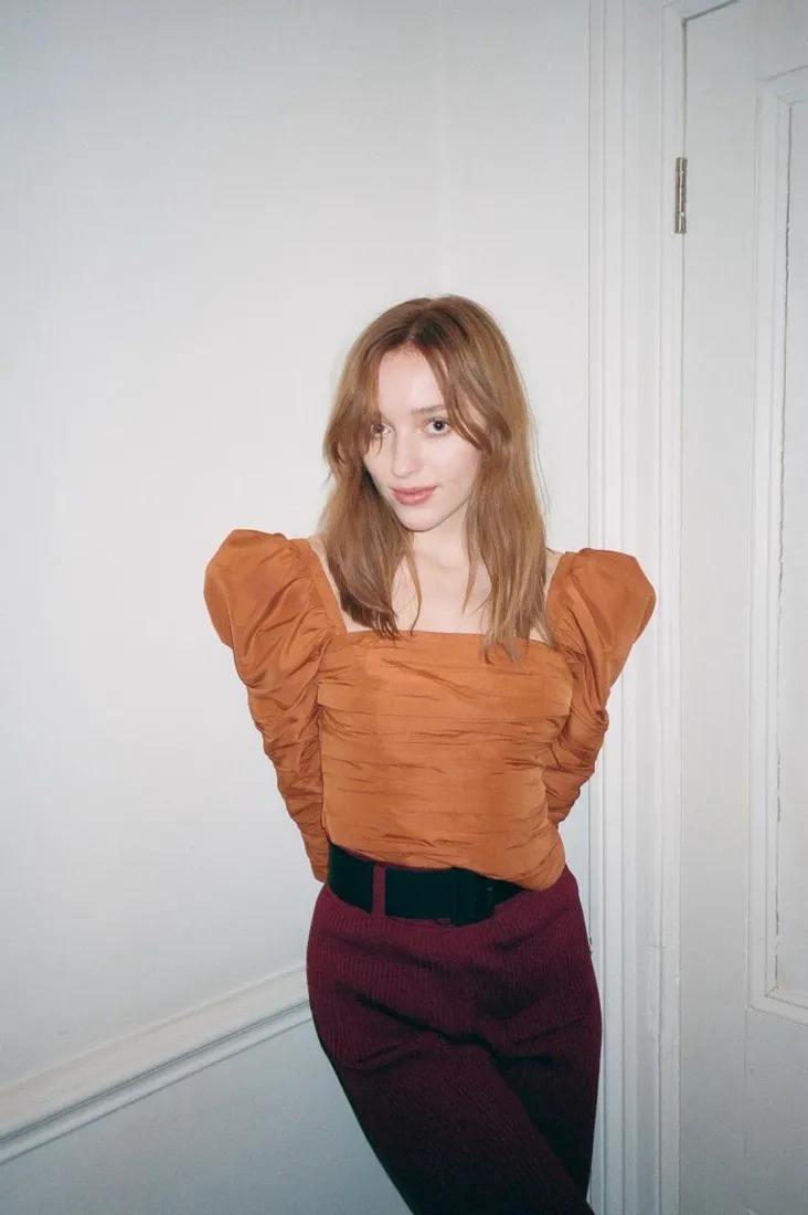 Phoebe Dynevor - nữ chính phim "Bridgerton" - làm mẫu với váy áo tôn hình thể.