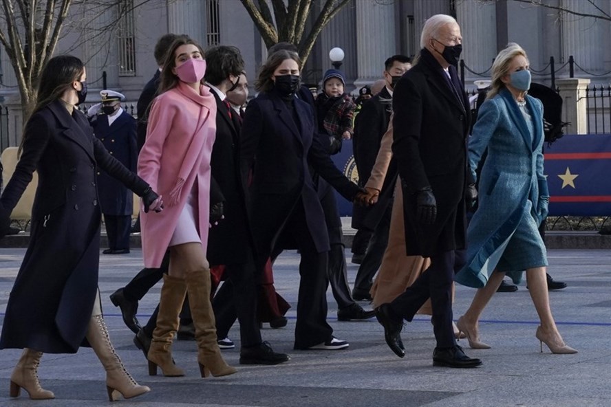 Tổng thống Joe Biden và Đệ nhất phu nhân Jill Biden cùng gia đình đi bộ lên đại lộ Pennsylvania đến cổng phía bắc của Nhà Trắng hôm 20.1. Ảnh: AFP.